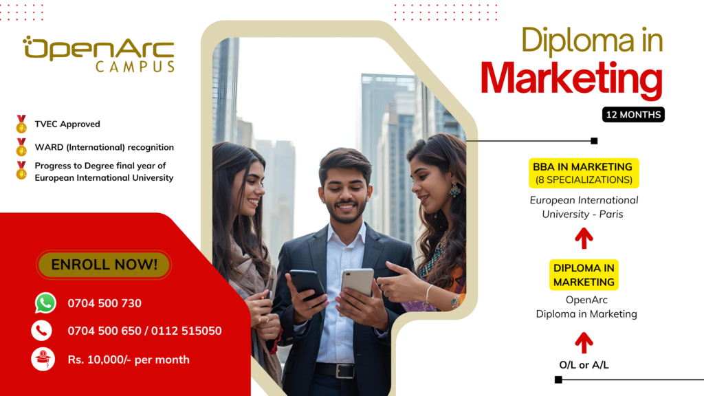 Are you an A/L student preparing for your exams, an O/L graduate seeking a high-income career in Business or Marketing, or a professional already working in the field looking for promotion or stronger sales performance? If so, this Diploma in Marketing has been designed precisely for you. The programme helps you gain a comprehensive understanding of marketing fundamentals while building the practical skills needed to apply them effectively.